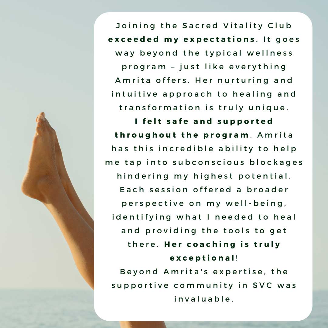 No time is ever wrong to start something new. The Sacred Vitality Club can be your sanctuary, providing support and guidance even amid the chaos of life.