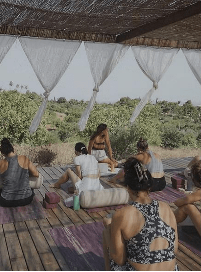 Beyond the abundant vegetable garden, our outdoor shala rests in nature with sweeping views of rolling hills and the distant sea, overlooking Porto Petro. From sunrise to sunset, this open-air haven invites breath and surrender. Mats and blocks are provided, with additional props easily brought from indoors.
