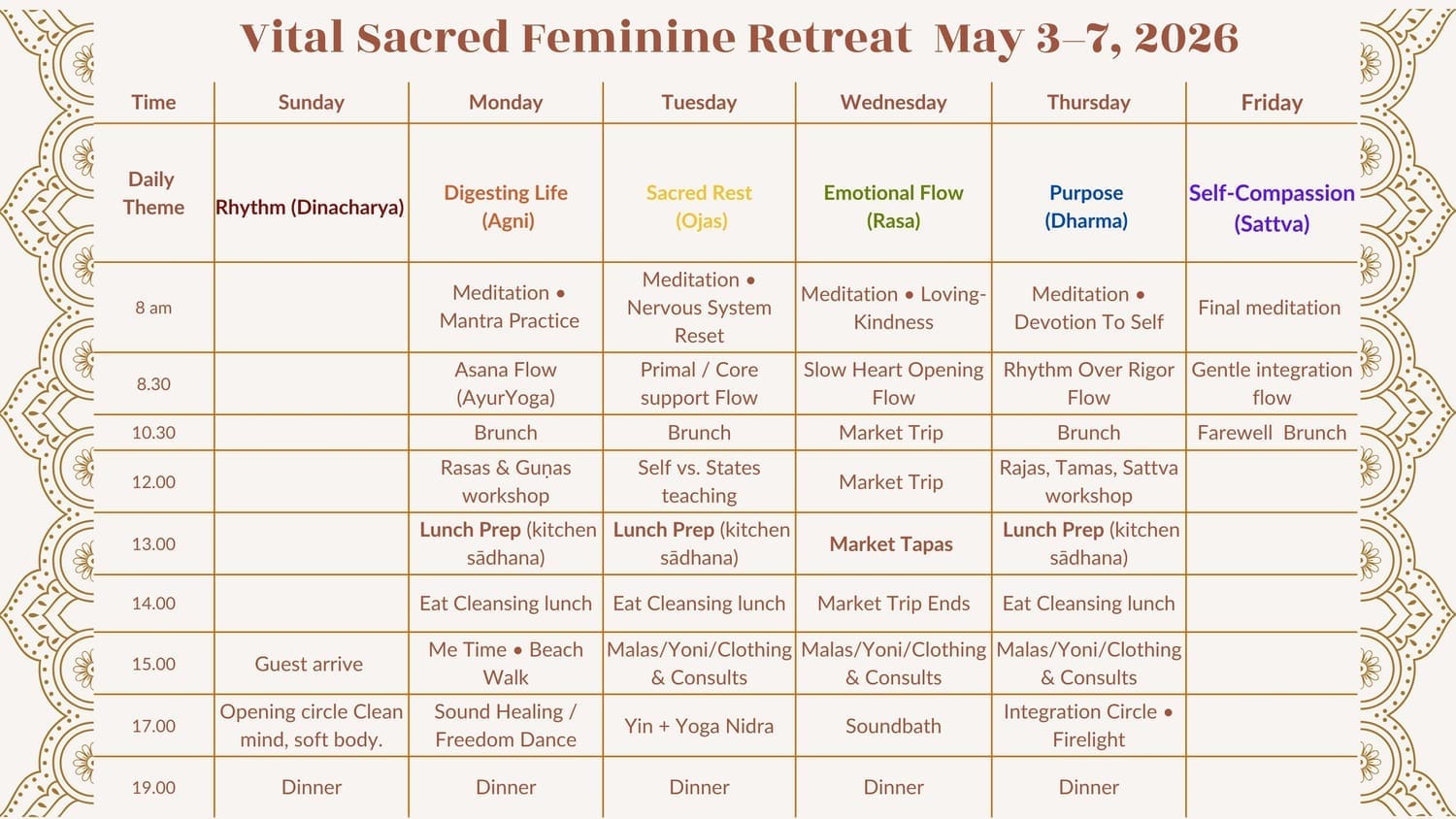 🛏 Includes: Lodging, Ayurvedic meals, all practices, kitchen workshops, and rituals