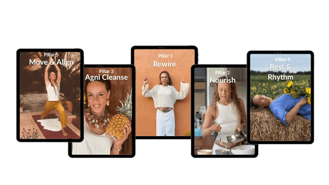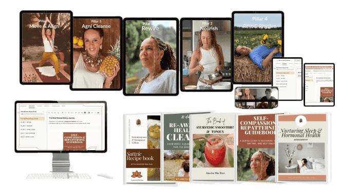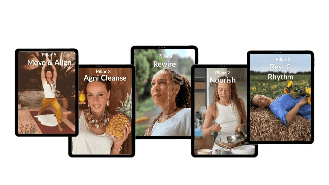 A 12-week, feminine-led transformation experience that rewires your nervous system, balances your hormones through Ayurveda, heals your digestion, and restores your radiant vitality — the way nature intended